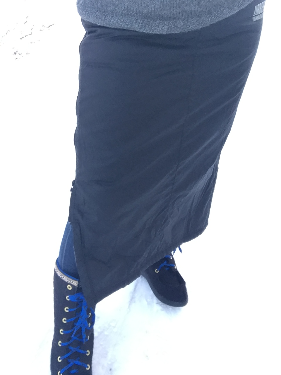 I sekken hadde jeg også en tykk ullgenser, BH-, boxer-, stilongs-, trøye-, votte- og sokkeskift, en dunjakke og et skjørt. Skjørt, tenker du kanskje? Ja, sier jeg! Det er på kanten til genialt. Jeg har et skjørt som rekker meg til leggen, med glidelås i sidene. Jeg smetter det på meg i pauser, på isfiske, i leir på fjellet og i solveggen på hytta. En gang holdt jeg på å fryse baken av meg, og da gikk jeg ned fra fjellet med skjørtet utenpå turbuksa. Jeg liker coreloft/primaloft bedre enn dun, fordi det tåler mer vann og tørker raskt, selv om det ikke er like varmt. Smak og behag, og det er ganske så stor prisforskjell.