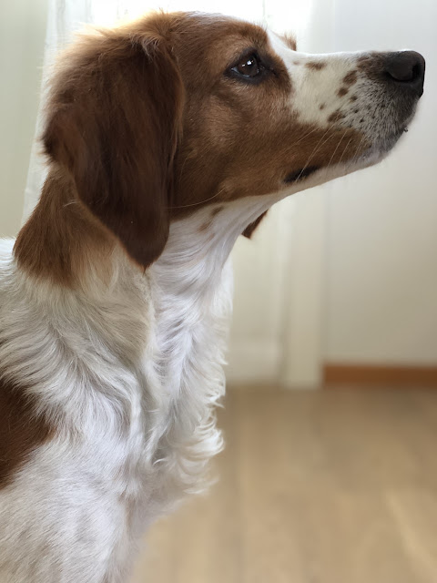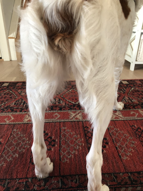 Så var det klipp av klør, kortklipping av pels fra haseledd og ned, jevne underlinje, stuss av halestubben med effileringssaks, vekk med rufs på ørene, jevne og skråstille faner og “bukse”. Breton skal være kvadratisk, så klippen skal framheve dette. Effileringssaks er tynnesaks som også frisører bruker. Fås på Biltema, av alle steder, for rundt en hundrelapp.